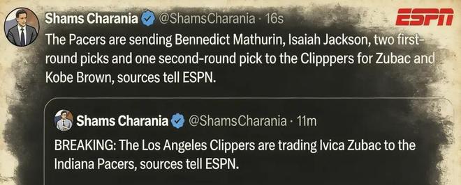 北京時間2月6日,據名記Shams報道,快船與步行者達成一筆2換5的交易,前者送出祖巴茨和科比·布朗,從後者引入馬瑟林、以賽亞·傑克遜、2個首輪簽(2026年受保護,2029年無保護)以及1個次輪簽。