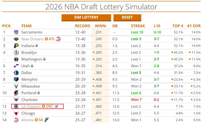 快船2026年的首輪簽在雷霆,目前快船這個首輪簽預測是12順位,隻要快船的戰績繼續下滑這個首輪簽就會繼續攀升,雷霆這下又躺贏了?