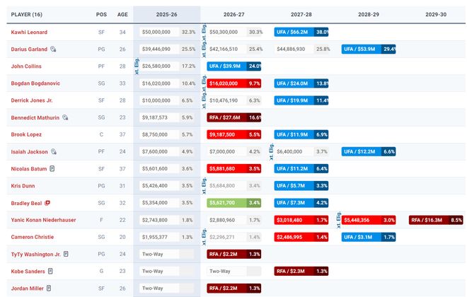 倫納德、加蘭、科林斯、博格丹諾維奇、瓊斯、馬瑟林、大洛、傑克遜、巴圖姆、鄧恩、比爾、尼德豪澤、克裏斯蒂;泰泰華盛頓、米勒、桑德斯(雙向合同)。根據此前的報道,快船進行交易後會轉正米勒、桑德斯的雙向合同,會跟這兩人簽下正式的新秀合同。