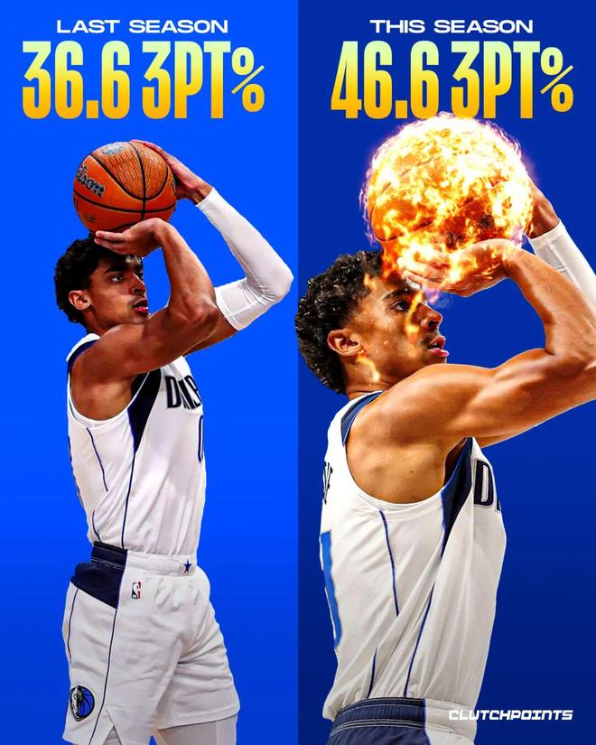 他的三分尤其瘋狂,場均出手5.2次,命中率超過46%,放眼全聯盟,場均出手5+三分的球員裏,隻有灰熊的斯潘塞(場均5.0次出手、命中率48.5%)和老鷹的克雷伊奇(場均5.8次出手,命中率46.9%)比他更準。