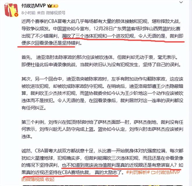 值得注意的是,這幾次漏判,裁判幾乎都看了錄像回放,在這種情況還出現漏判錯判,實在令人不解。對此,媒體人付政浩怒斥:當值裁判是真的近視眼還是有意裝盲人?如果真的近視還堅持在CBA賽場執裁, 真的太勵誌了。