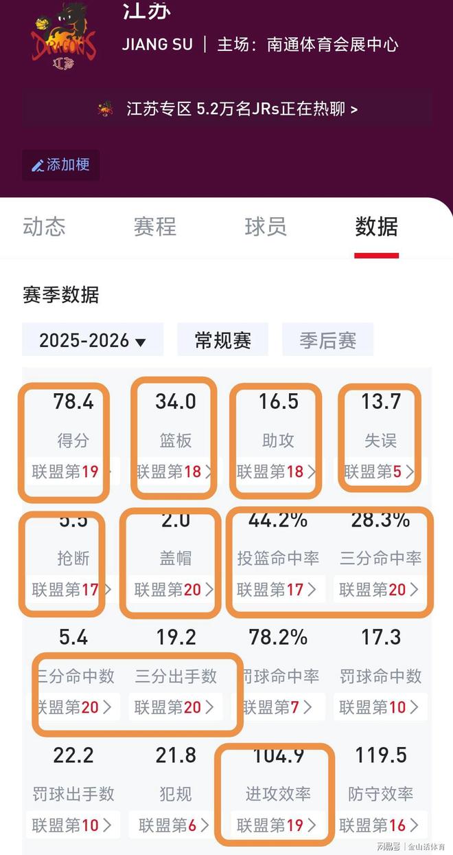 截止CBA聯賽第12輪,江蘇隊戰績為1勝11負,目前排在CBA積分榜倒數第二位,僅次於開賽初期一直用全華班的四川隊。而打開江蘇隊的數據統計,一排排數據慘不忍睹。三分球命中數、出手數、命中率、蓋帽數,4項數據均為聯盟倒數第一;場均得分、進攻效率,2項數據為聯盟倒數第二;場均籃板、助攻,2項數據為聯盟倒數第三……