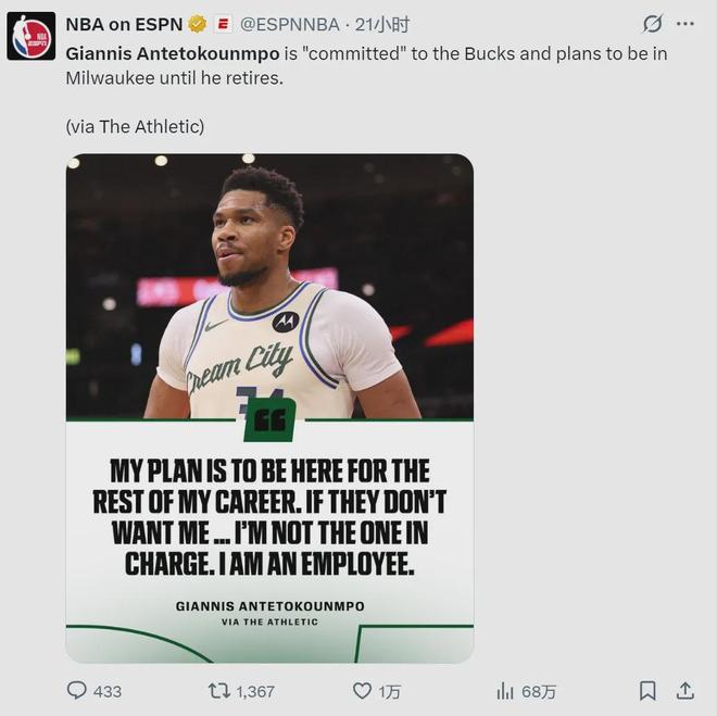 字母哥接受采訪時,再次向雄鹿表忠心:“我永遠不會提出交易請求,這不是我的性格。我哪裏都不去,我對雄鹿全身心投入。我的計劃是在雄鹿打到退役,除非雄鹿不想要我了。我無法控製別人說什麽,但我自己從未說過要離開。”