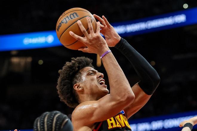 全場數據,老鷹隊這邊,“鷹王”傑倫-約翰遜16投9中,轟下23分11籃板6助攻2蓋帽;沃克18中9砍下24分2籃板3搶斷;肯納德三分9中6貢獻22分;麥科勒姆首秀14中5得到12分4助攻,表現中規中矩;基斯珀特首秀4中0,僅得2分2板3助攻。