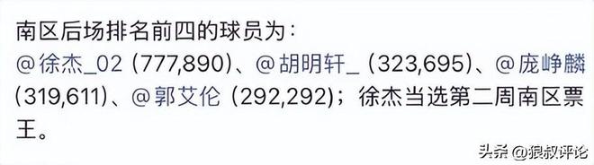 最為具有看點的是,南區首發後衛的競爭,達到非常慘烈的地步,徐傑以70萬票坐穩票王位置外,另外一個首發位置獲票非常接近。