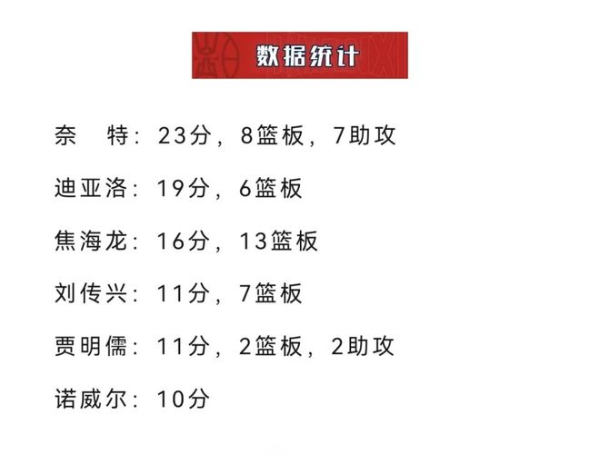 全場比賽,山西男籃共有5人得分上雙,外援奈特得到了全場最高的23分。值得一提的是,奈特此役還搶下8個籃板球並送出7次助攻,助攻數同樣為全場最佳。
