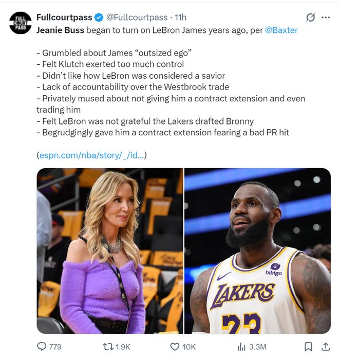 隨後珍妮-巴斯委托TA記者薩姆-阿米克對ESPN的長文辟謠:鑒於LBJ為湖人所做的一切,他被卷入了我的家族紛爭這太離譜了。ESPN的報道並不真實,對LBJ來說也太不公平。