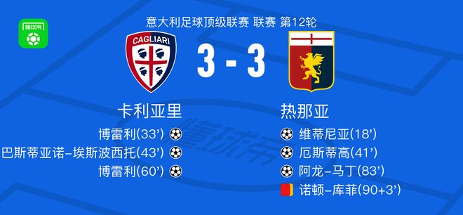 北京時間11月22日意大利足球頂級聯賽 聯賽 第12輪,卡利亞裏主場對陣熱那亞。卡利亞裏博雷利梅開二度,塞巴斯蒂亞諾-埃斯波西托破門。熱那亞維蒂尼亞破門,厄斯蒂高破門,阿龍-馬丁破門。最終比分卡利亞裏 3-3 熱那亞。