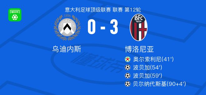北京時間11月22日意大利足球頂級聯賽 聯賽 第12輪,烏迪內斯主場對陣博洛尼亞。博洛尼亞波貝加梅開二度,貝爾納代斯基破門。最終比分烏迪內斯 0-3 博洛尼亞。