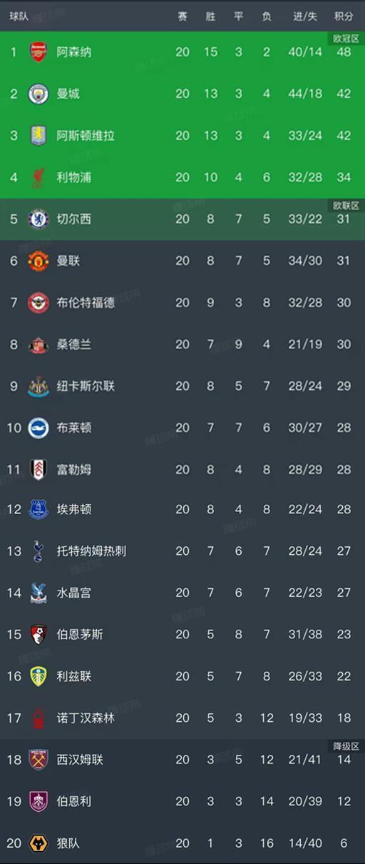 曼城遭遇兩連平,積分上漲到42分,已經落後槍手6分,而且積分和阿斯頓維拉持平。藍軍同樣是兩連平,而且連續4輪不勝,以31分暫列第5名,已經把前三名拉開了分差,衝擊第四名爭搶歐冠門票更加務實。阿斯頓維拉本輪在主場3-1戰勝了諾丁漢森林,避免了連敗。