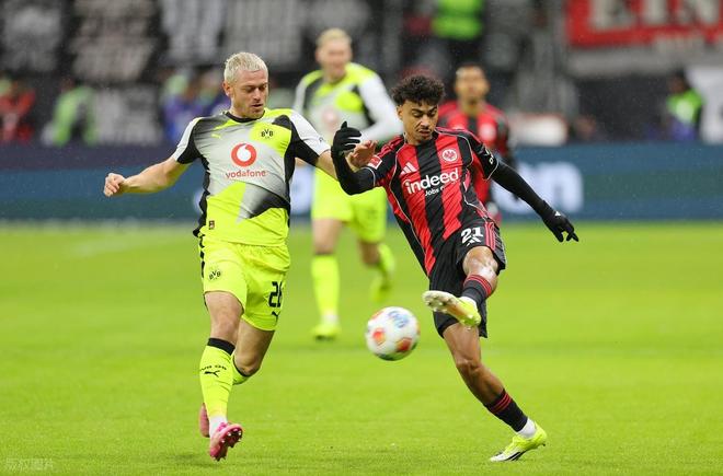 第19分鍾,法蘭克福前場右側邊線球,克裏斯藤森大力往禁區裏擲過去,泰特前點搶點頭球擺渡一頂,吉拉西爭搶第2落點時推倒科赫,主裁果斷吹罰了點球。尤尊操刀主罰一蹴而就,法蘭克福1:1快速扳平比分。易邊再戰兩隊還是對攻之勢,第67分鍾,多特前場左側轉移到右側,連續的傳中都被法蘭克福擋出,隻是法蘭克福多次解圍都未能將球踢遠,最後一次泰特解圍反而是踢到禁區右側前沿恩梅查的腳下,恩梅查將球攔下調整一步右腳大力掃射,皮球擊中右側門柱內側彈入網窩,多特2:1再次取得領先。