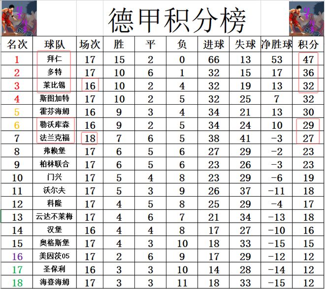 積分榜方麵,拜仁上半程以11分的巨大優勢輕鬆拿到半程冠軍,本輪他們將在客場對陣下半程第一個對手萊比錫,本賽季首輪拜仁就是在主場6:0狂勝萊比錫開了個好頭,現在萊比錫和多特是潛在的稍微有些可能追趕拜仁的球隊,因此本輪客場再戰萊比錫,將是拜仁下半程的關鍵一戰。法蘭克福今天本有機會追上勒沃庫森,隻是兩度領先沒有把握機會,最後絕平,差勒沃庫森2分還是排在第7。