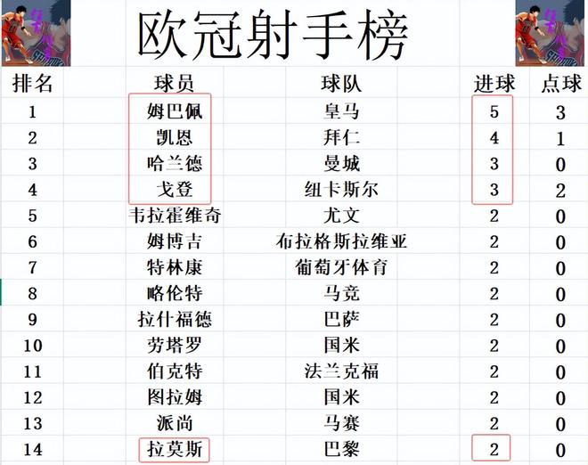 射手榜方麵,姆巴佩5球領跑,凱恩4球排在第2。哈蘭德今天梅開二度,戈登點射雙響,兩人3球升至第3。拉莫斯打入絕殺球,追上勞塔羅,拉什福德,韋拉霍維奇等人2球剛好擠入前十。