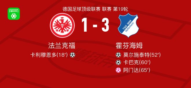 北京時間1月24日,德國足球頂級聯賽第19輪,法蘭克福主場對陣霍芬海姆。卡利穆恩多率先破門,為法蘭克福取得領先;隨後莫爾施泰特破門,卡巴克再入一球,霍芬海姆連扳兩球反超;阿門達不慎自擺烏龍,令霍芬海姆擴大優勢。最終,法蘭克福1比3不敵霍芬海姆。